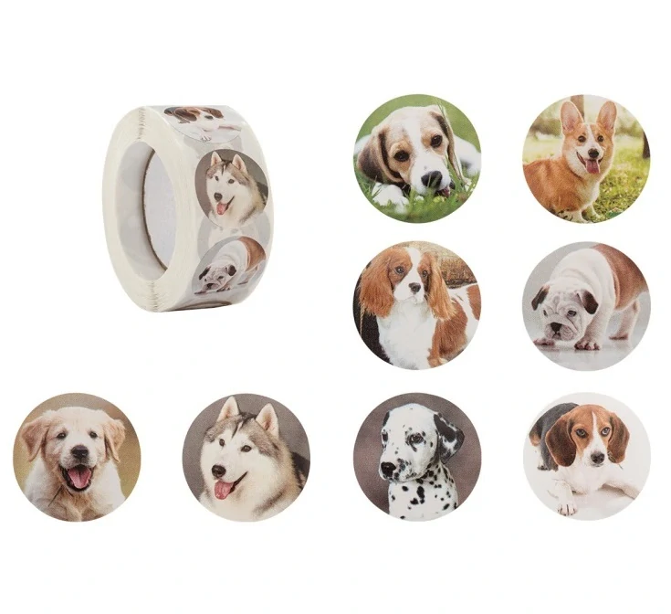 Malé samolepící dekorativní kulaté designové obrázky s fotkami pejsků jsou perfektní pro různé zdobení a DIY tvorbu pro milovníky psů.