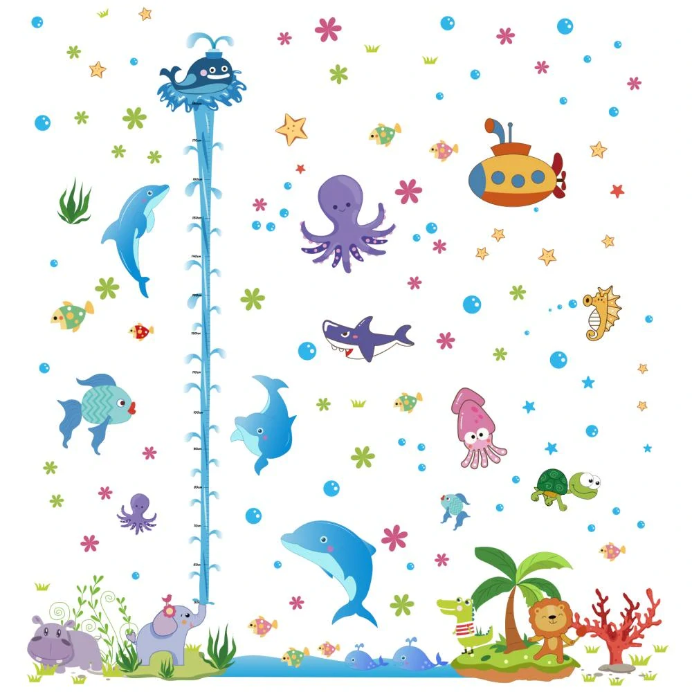 Veliká samolepící dekorace na zdi do dětského pokoje v podobě podmořského světa plného ryb, mořských živočichů a rostlin, dále také ponorka a navíc také růstový metr s velrybou. Malí milovníci podmořského světa, poměřte svou výšku a vyzdobte si svůj pokoj. Děti rostou jako z vody, nenechte si ujít zábavu a zapisujte každou chvíli jejich výšku na samolepící metr na zeď třeba v jejich pokojíčku.