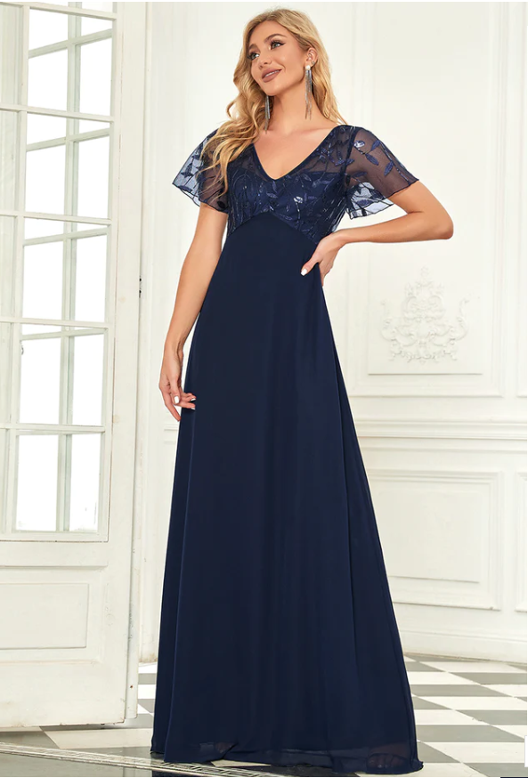 Večerní róba v navy blue, dlouhé slavnostní temně modré šaty zdobené v horním díle jemnými lesklými lístečky a krátkými rukávky z průsvitné látky. Působivé společenské večerní plesové dlouhé šaty, které z Vás udělají tu pravou elegantní dámu. Eshop Tvujdesign.cz má pro Vás velkou spoustu dokonalých dětských, dívčích i dámských šatů, spodniček a sukýnek.