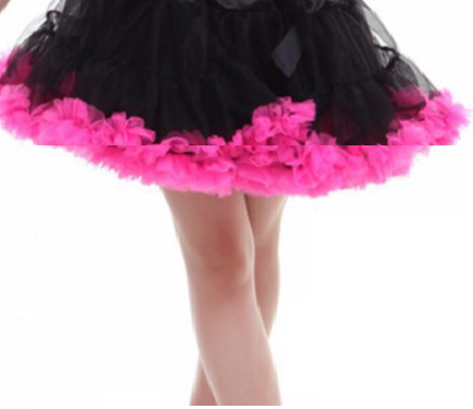 Jedna z nejoblíbenějších barev u dívek je tato černá se spodním lemem sytě fuchsiově růžové. Krásně vynikne a dá se dobře kombinovat. Ideální na tanec, párty, oslavy, balet, focení, svatby apod. Má 3 vrstvy (2x tyl velmi hustě řasený a 1x satén ve spodní části, takže neprosvítá).